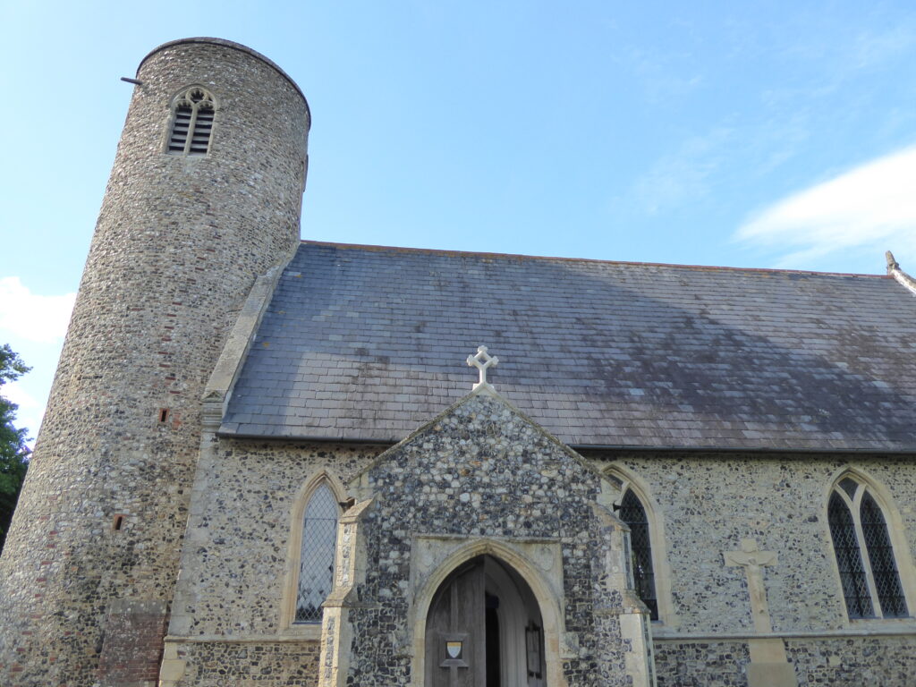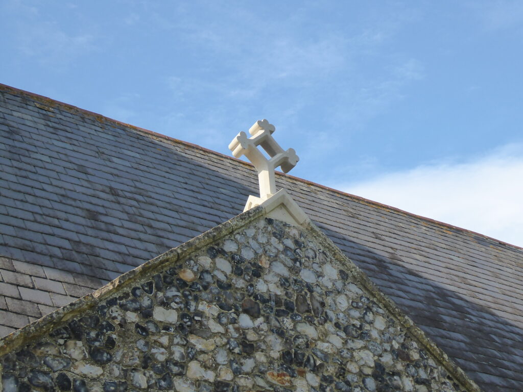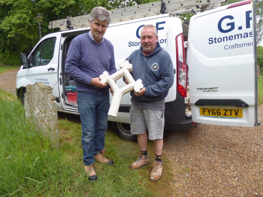 We are pleased to say that at long last a new cross has been installed on the apex of the church porch roof. The original, which was very old, came down in a gale several years ago, and the pieces have been lying in a pile at the back of the church ever since. As nearly as possible the new cross, which was made and put in place by the firm of G.F.A. Stonemasonry Ltd., of Norwich, has been made to match the original, referring to old photographs and using the remaining pieces as a template. Many thanks to the craftsmen involved for their work; the result is fantastic. The new cross is the gift of one of our members, in memory of her sister, Sue Arnold, who died in April 2025