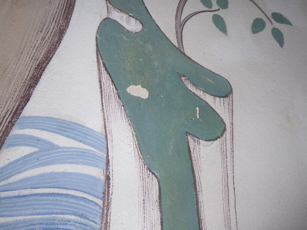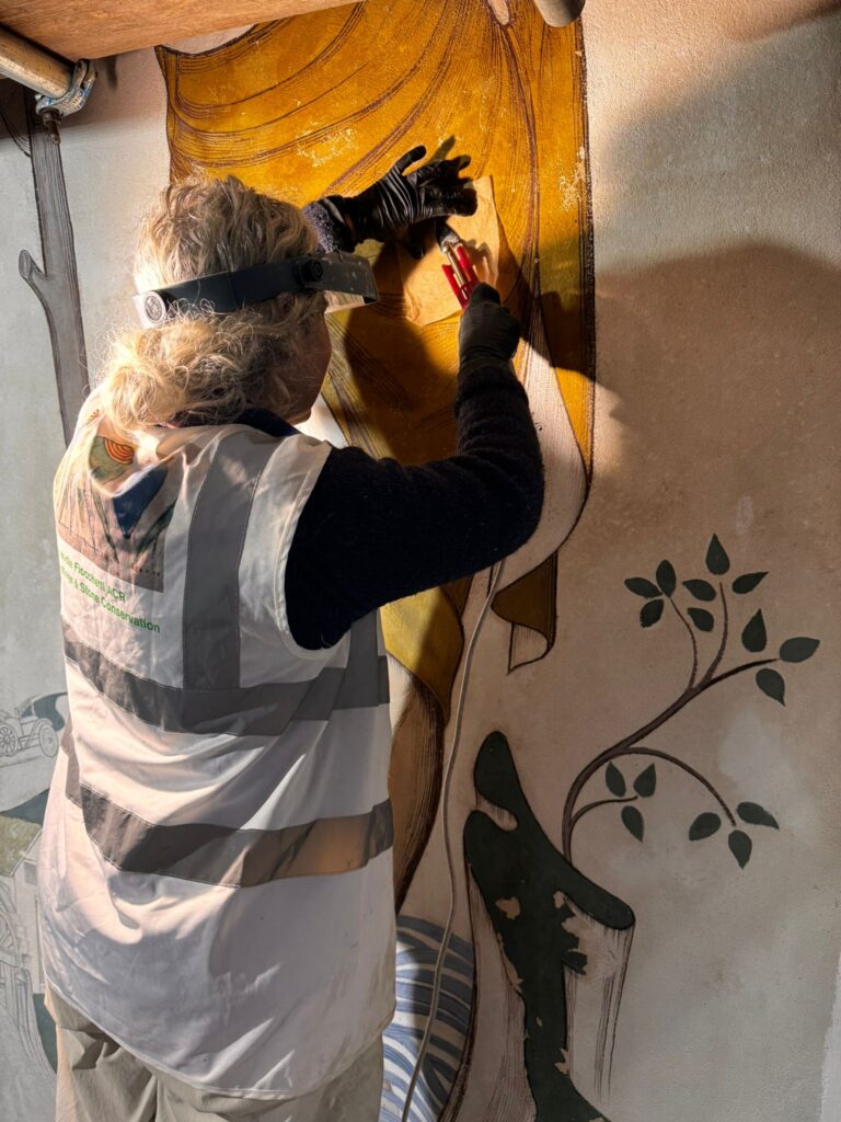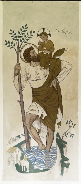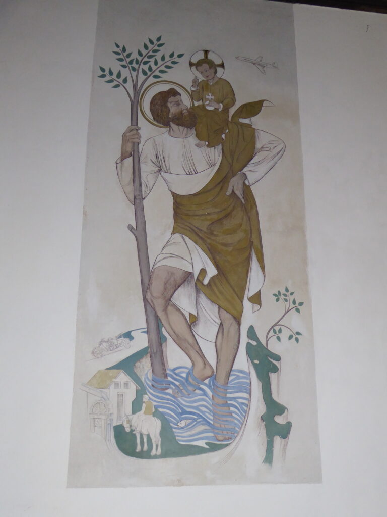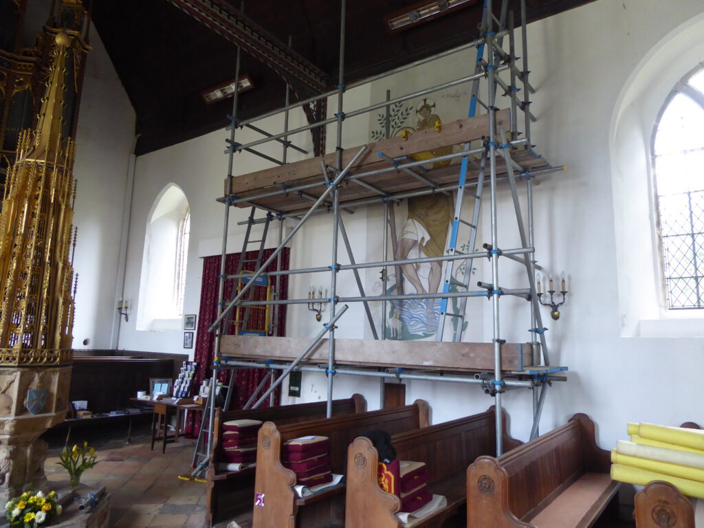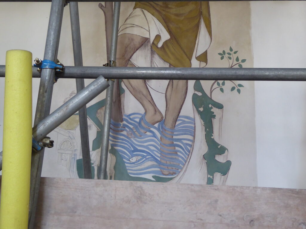 The Quinquennial inspection of 2019 noted some minor flaking in the famous mural of St. Christopher on the north wall of the church, the original work of Sir Ninian Comper. Following the inspection, a great deal of other work was carried out in the church, including among other things, re-plastering the inside of the tower walls, and major refurbishment of the windows. These works improved dryness in the whole building and considerably altered the airflow and general atmosphere. Unfortunately the changes also affected St. Christopher, whose condition deteriorated rapidly, accelerating the flaking, so that we felt we might be in danger of losing the mural altogether. It became apparent that urgent action was needed to save it.