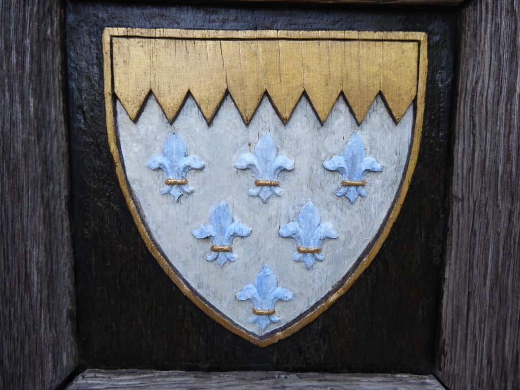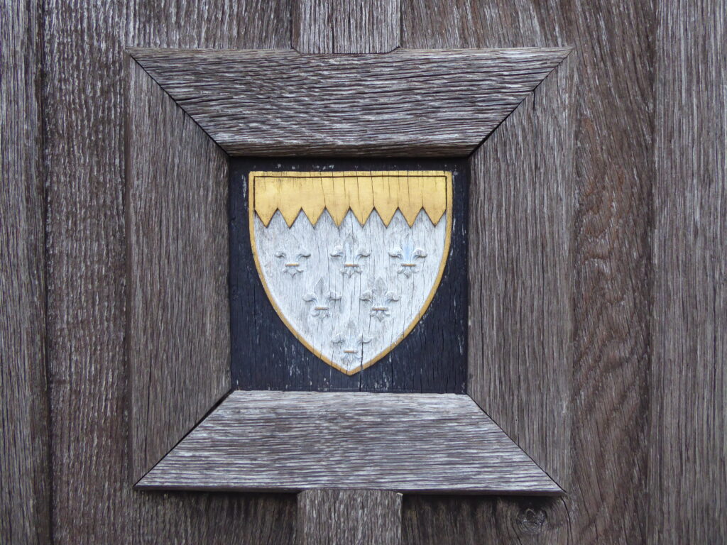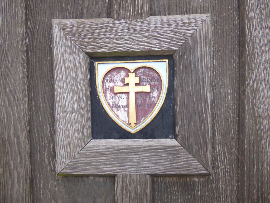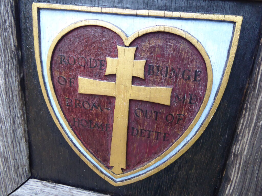 At the same time, since conservators were to be on the premises, we took the opportunity to order the repainting and conservation of the two armorial shields on the south doors, which were both cracked and faded. The shields respectively bear the arms of the Paston family, and of Bromholme Priory (where the doors originated); the latter carries the legend of the Priory, and had become totally illegible.